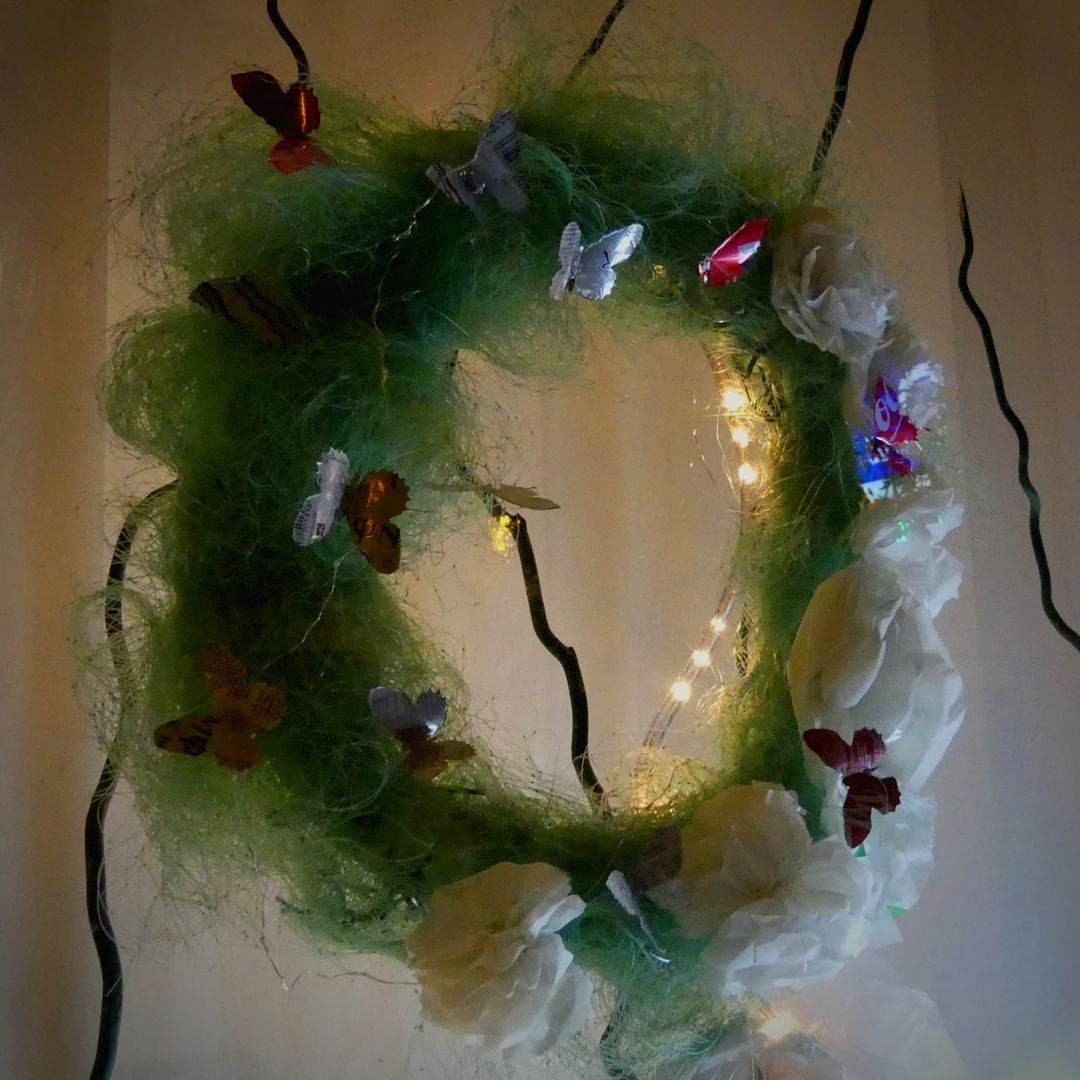 @coworkingvalencia con una corona hecha con redes, bolsas y latas de refresco