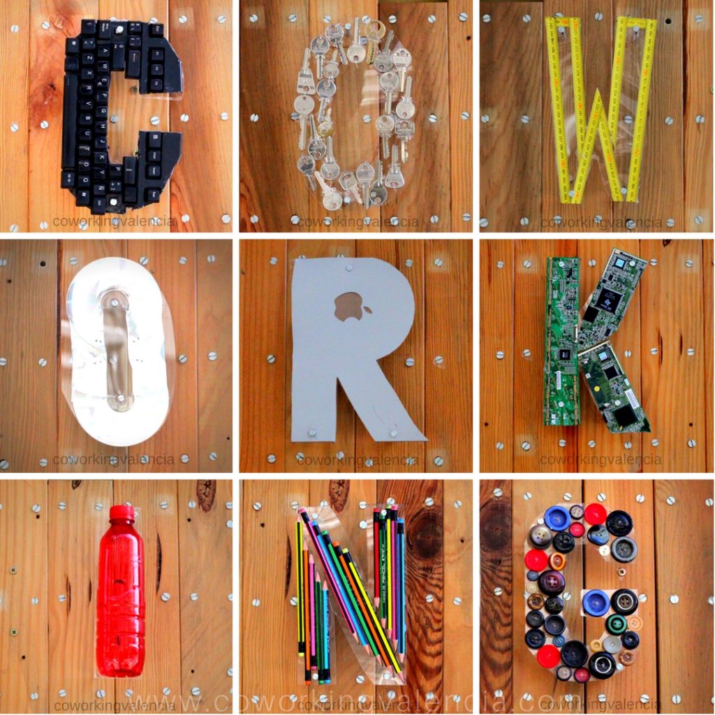 La base del cartel está hecha con unos listones encontrados en un contenedor, y cada letra está realizada con un material reciclado diferente.