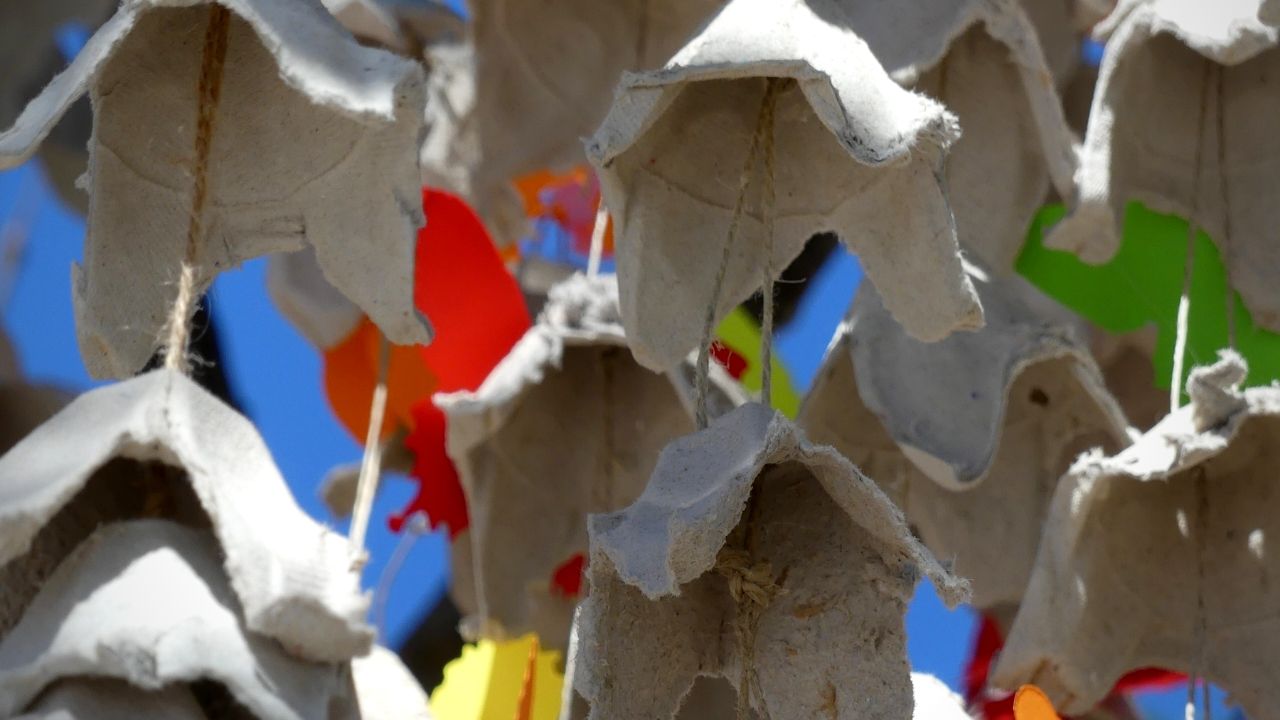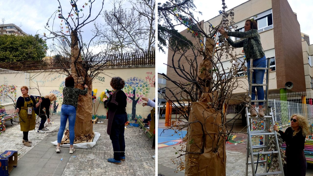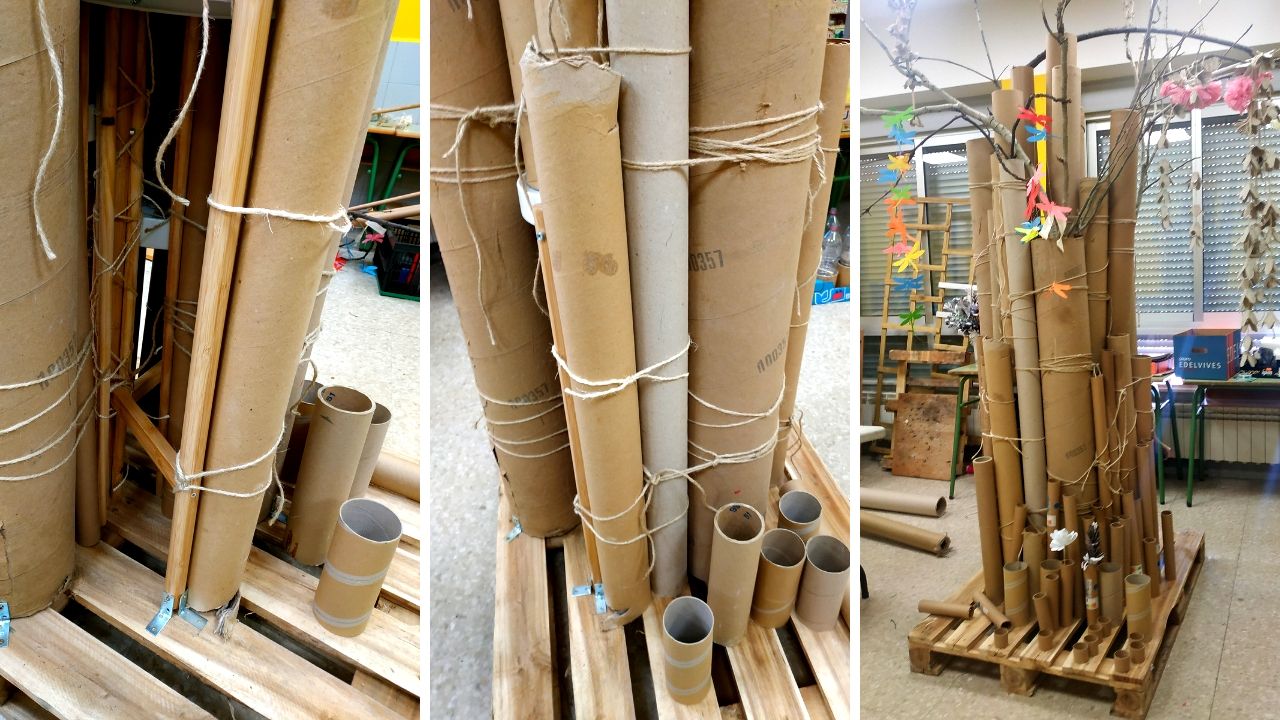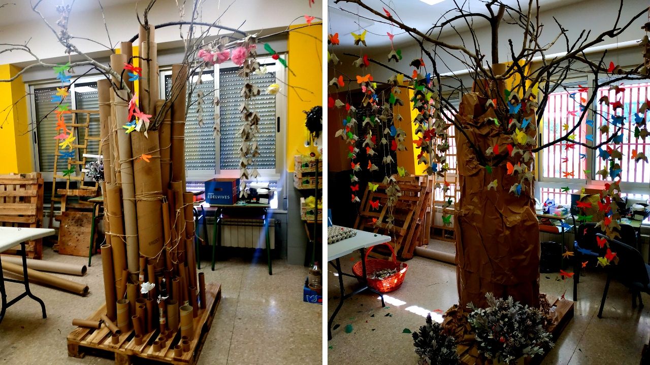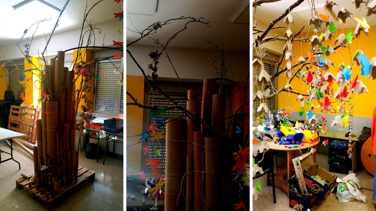 Para la realización del sauce se utilizó como base un palet de madera, para el tronco se utilizaron tubos de cartón que luego se forraron con papel craft, para las ramas se usaron los restos de la poda de los árboles del centro educativo y para las hojas se realizaron guirnaldas con hueveras de cartón.