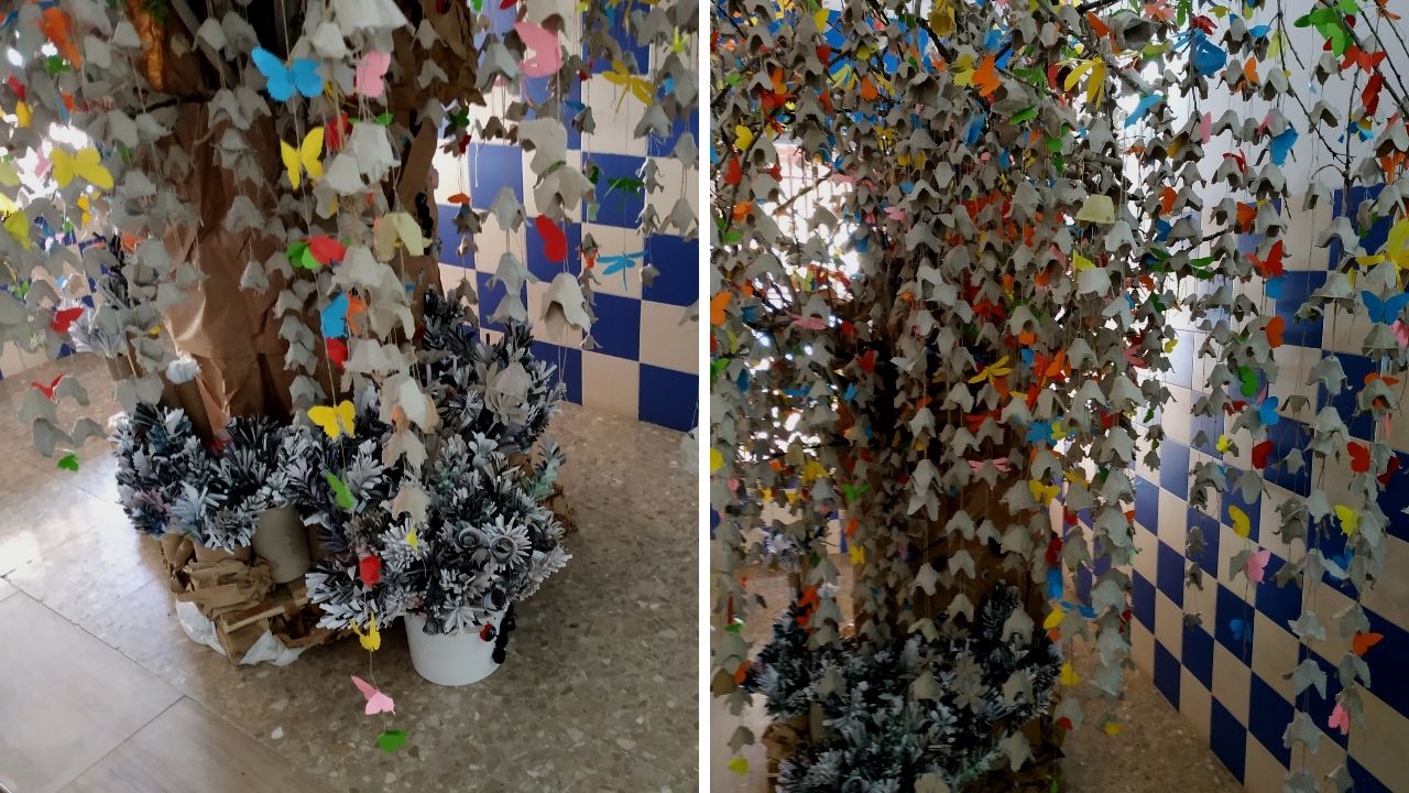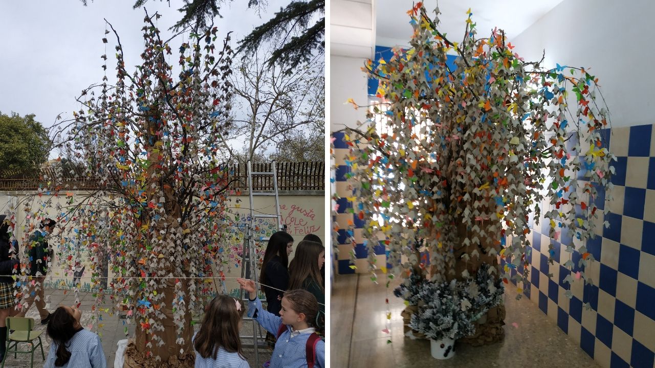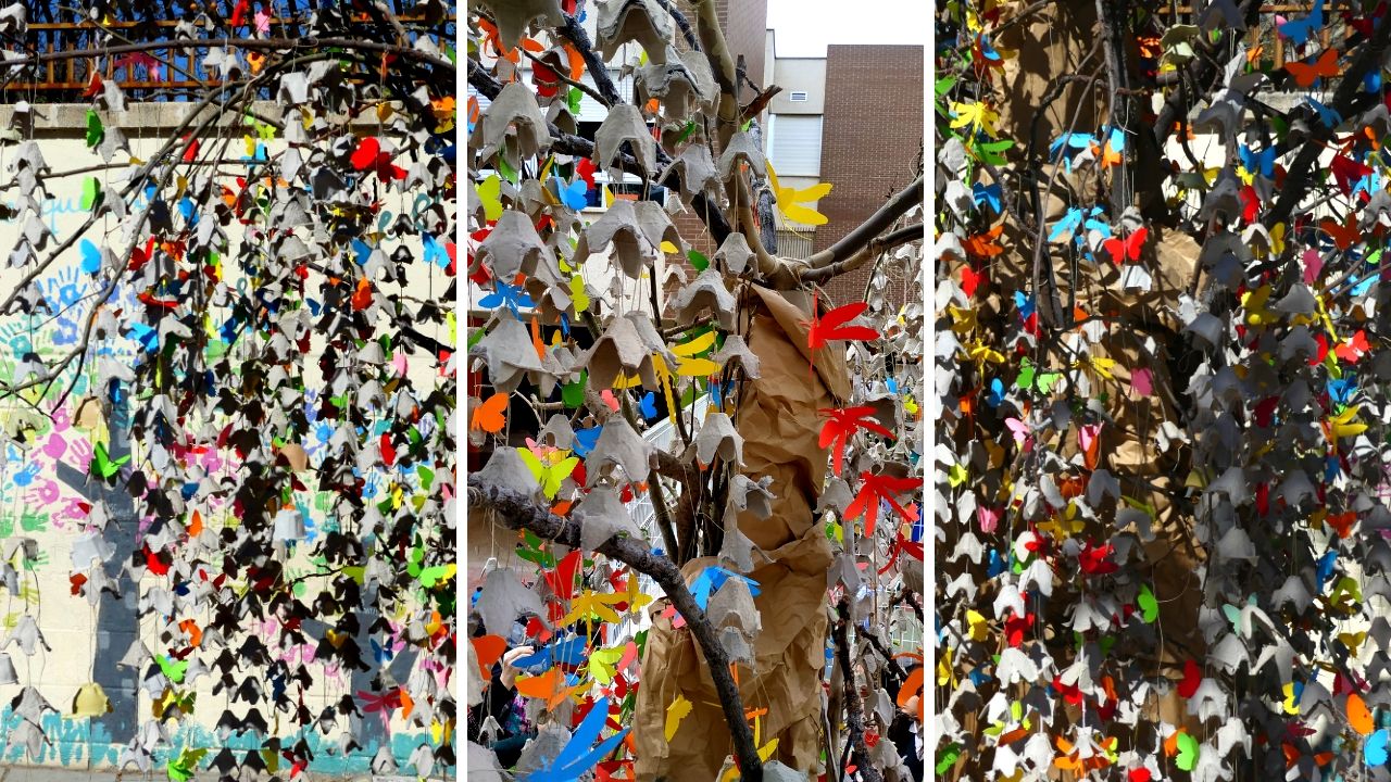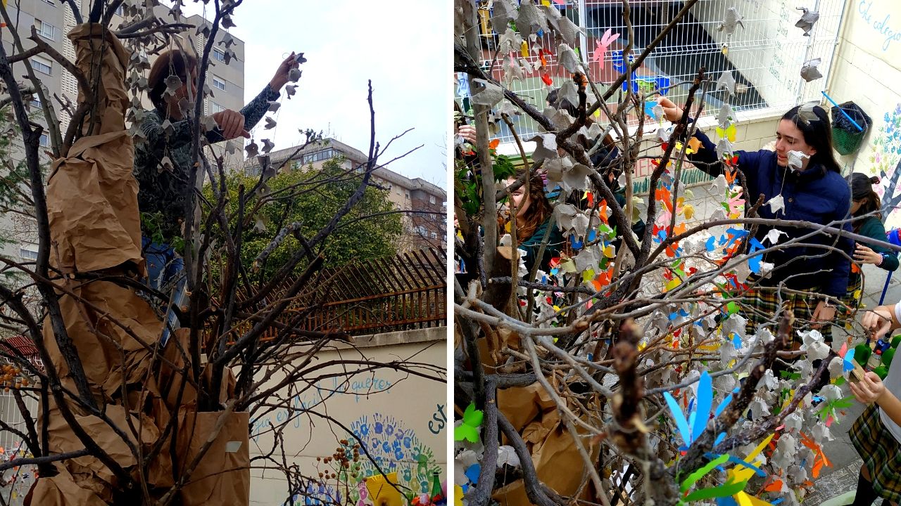 Los alumnos más mayores colaboraron colocando las guirnaldas que habían realizado en las aulas. Los más pequeños hicieron mariposas y libélulas con papeles de colores.