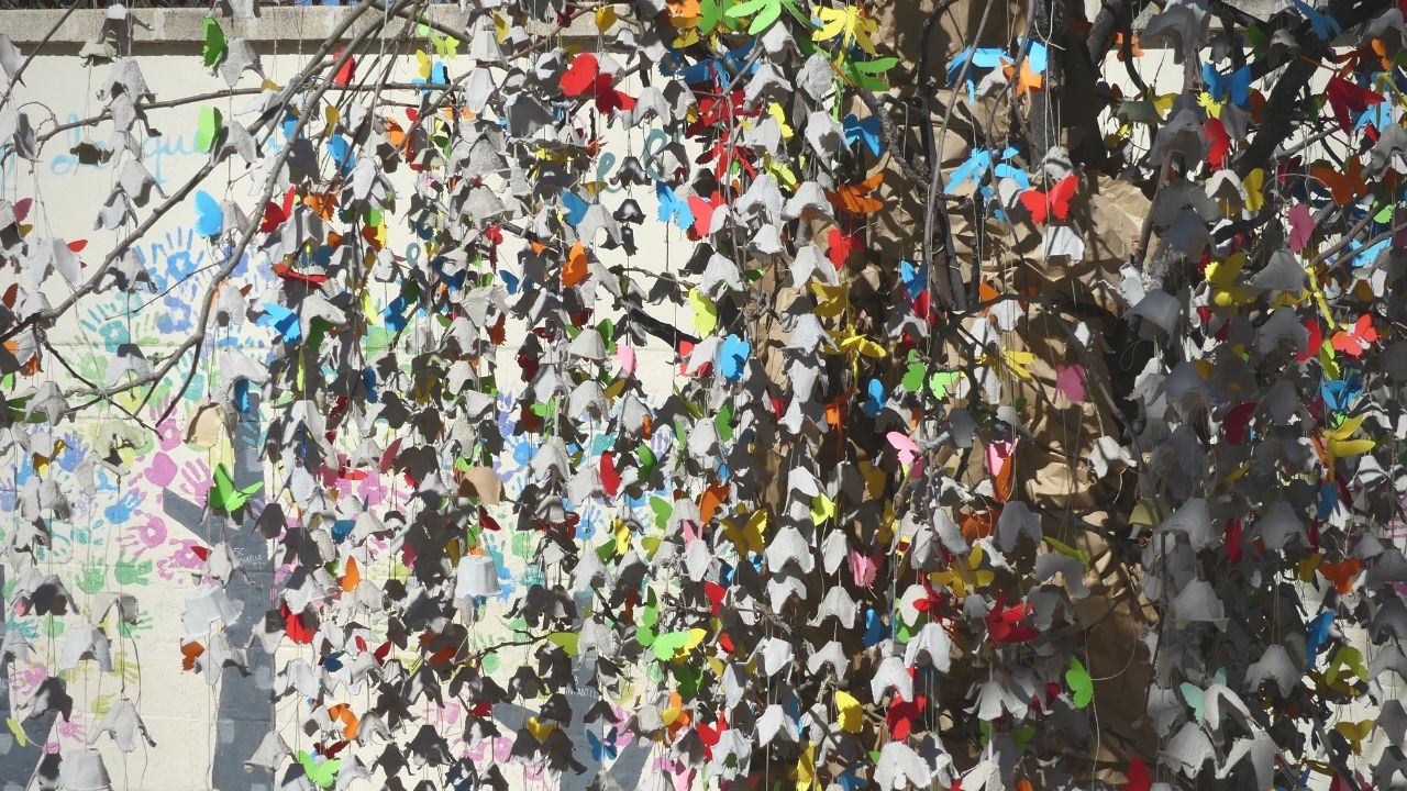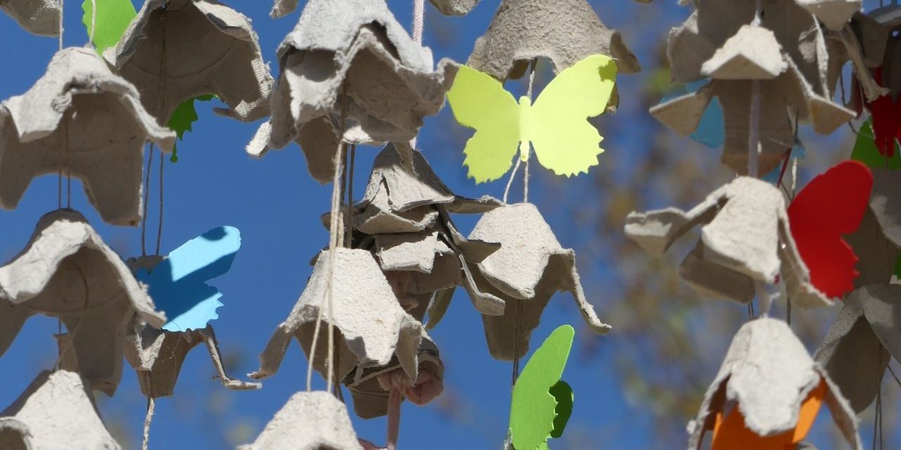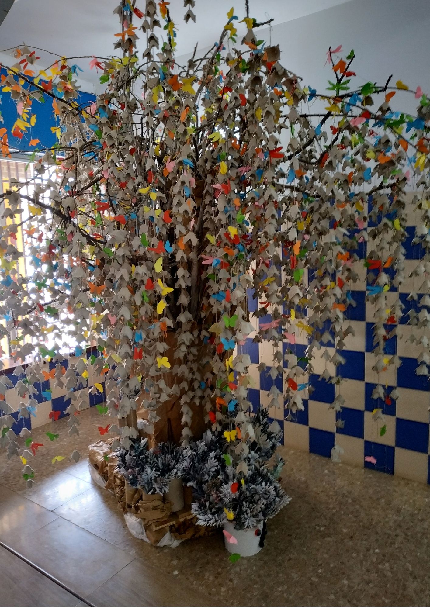 Los alumnos más mayores colaboraron colocando las guirnaldas que habían realizado en las aulas. Los más pequeños hicieron mariposas y libélulas con papeles de colores.