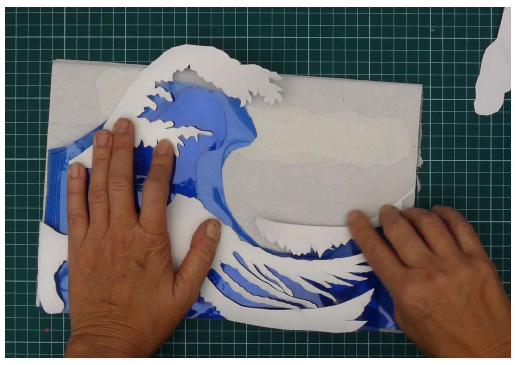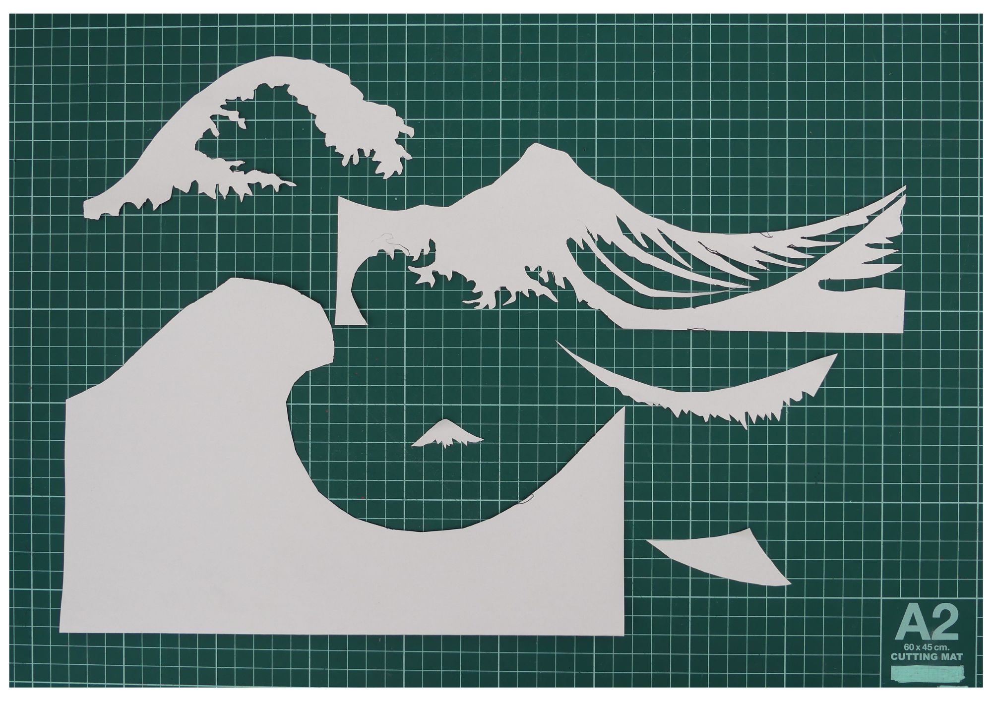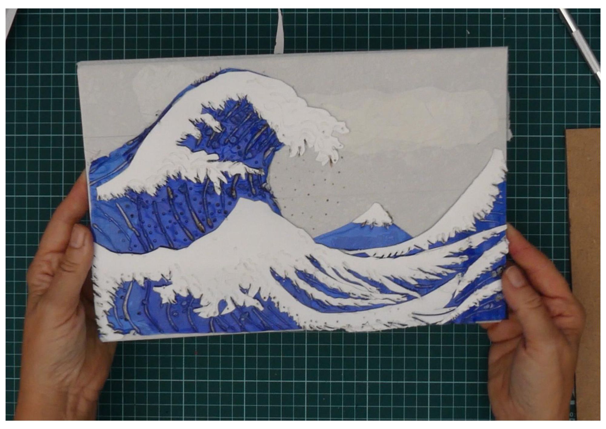 Me ayudó a definir la espuma de las olas, la posición del pico y la relación entre espuma y agua con los materiales limitados. Trabajar con plantillas me permitió reproducir los rasgos característicos de la obra original y controlar las proporciones en la base-soporte.