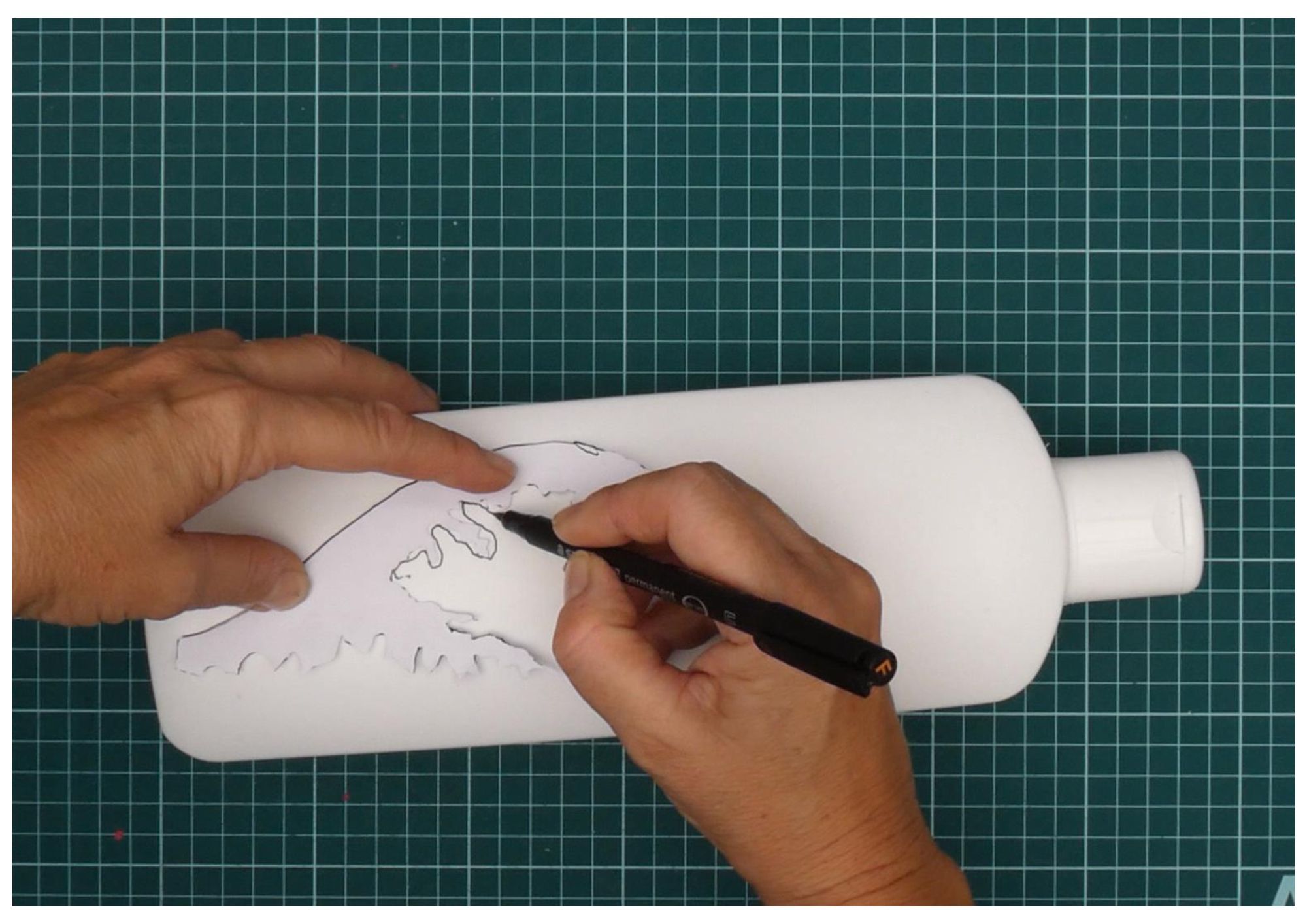 Coloqué las plantillas sobre las botellas y las marqué con rotulador para plásticos, adaptando curvas y detalles a la forma del envase.