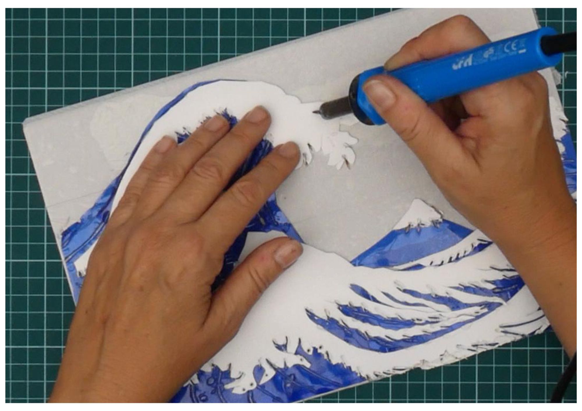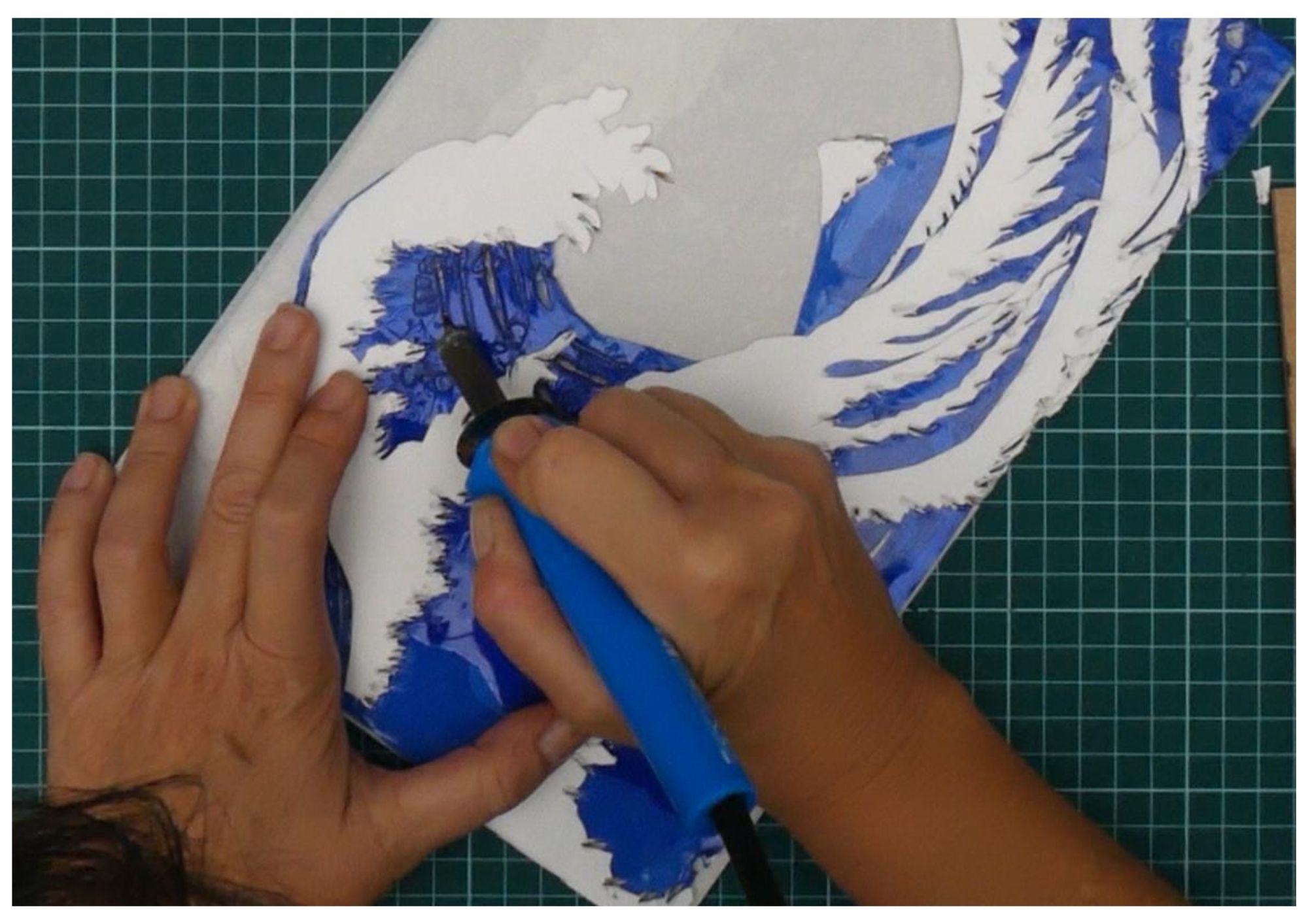 Con el pirograbador (punta caliente) soldé las capas entre sí y marqué texturas: líneas curvas en las zonas azules para acentuar el oleaje; soldé y “punteé” las bases blancas para crear espuma, relieve y pequeños cráteres de luz.