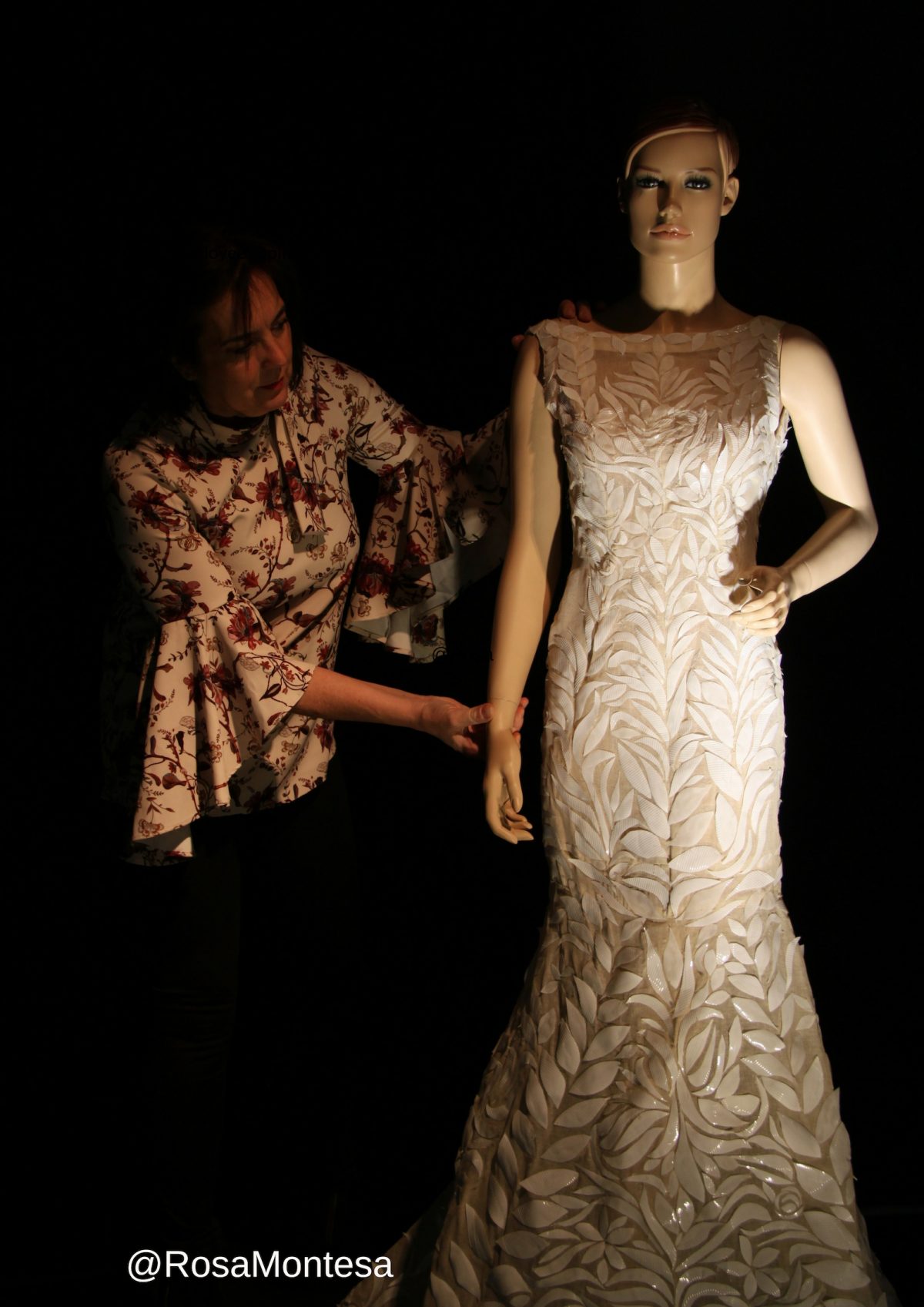 Otra pieza expuesta es un vestido de novia que ha sido embellecido con un estampado hecho con vasos de plástico.