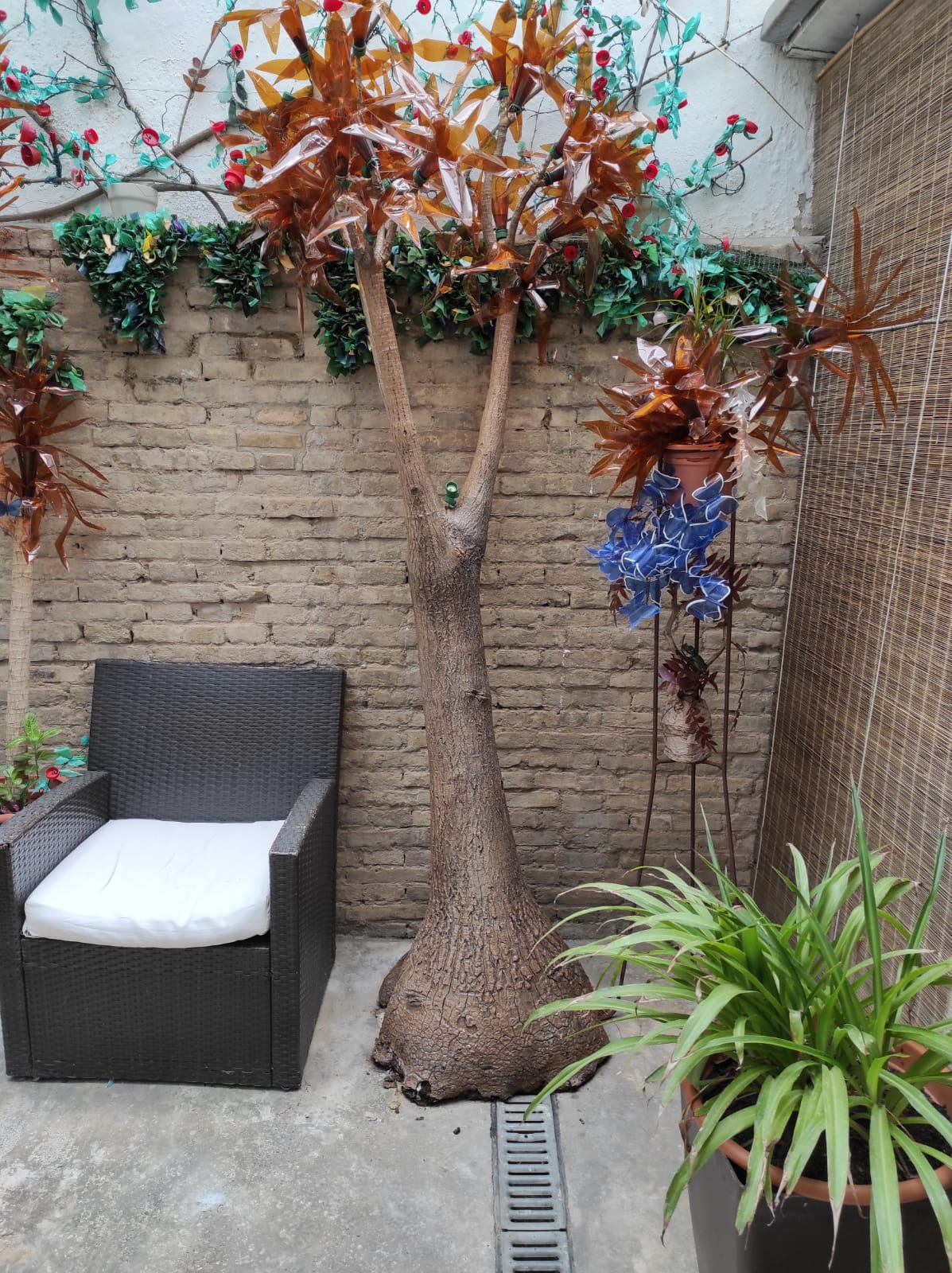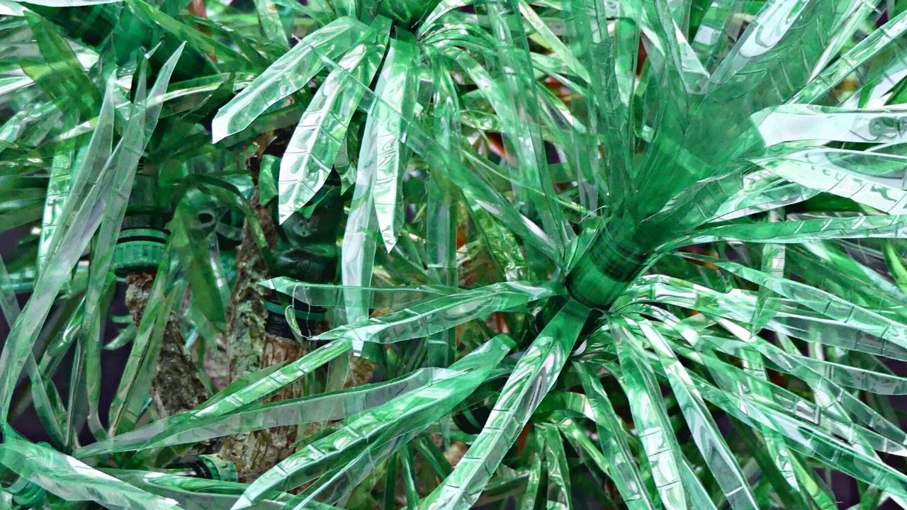 Plantas, hojas, arbustos y flores realizadas con botellas de plástico y ramas vegetales.