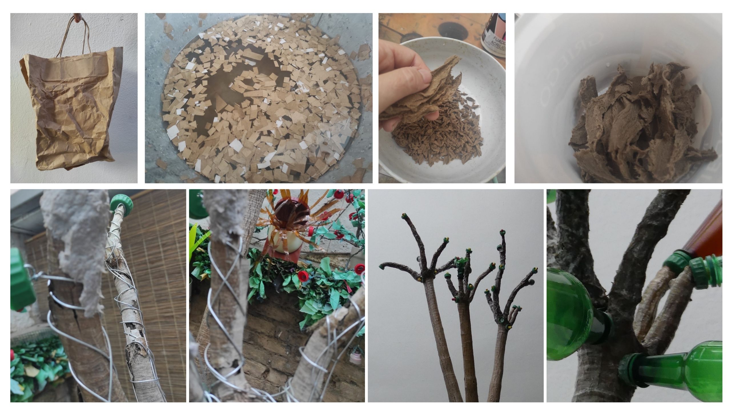 LAS RAMAS de la parte superior estaban secas (y húmedas por dentro), tuve que restaurarlas. Aproveché la forma que tenían, hice un alma de alambre y las «forré» con una pasta de papel (cartón piedra, papel couché, etc) Para hacer la pasta, utilicé unas bolsas de color marrón craft. Las ramas que estaban bien solamente las forré con la misma pasta marrón para igualar los colores y reforzarlas.