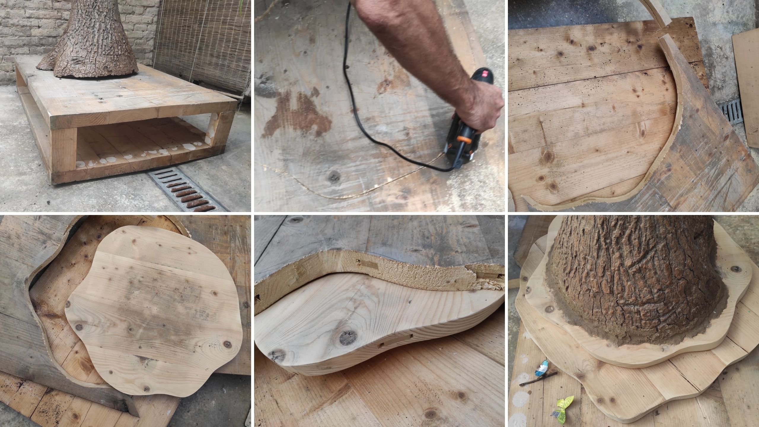 Para sanear la base tuve que recortar algunas zonas. La corteza se quedaba demasiado frágil y era necesario reforzarla y ponerle alguna especie de peana. Para ello utilicé un pallet rescatado de un contenedor de obra. No se trataba del típico pallet de listones de madera, este era una auténtica maravilla. Tenía dos superficies planas de una madera robusta de más de 4,5 cm de espesor. Recorté las dos superficies dando una forma caprichosa, luego las lijé y las bases quedaron perfectas. Todavía sigo sin comprender cómo somos capaces de tirar estos objetos.