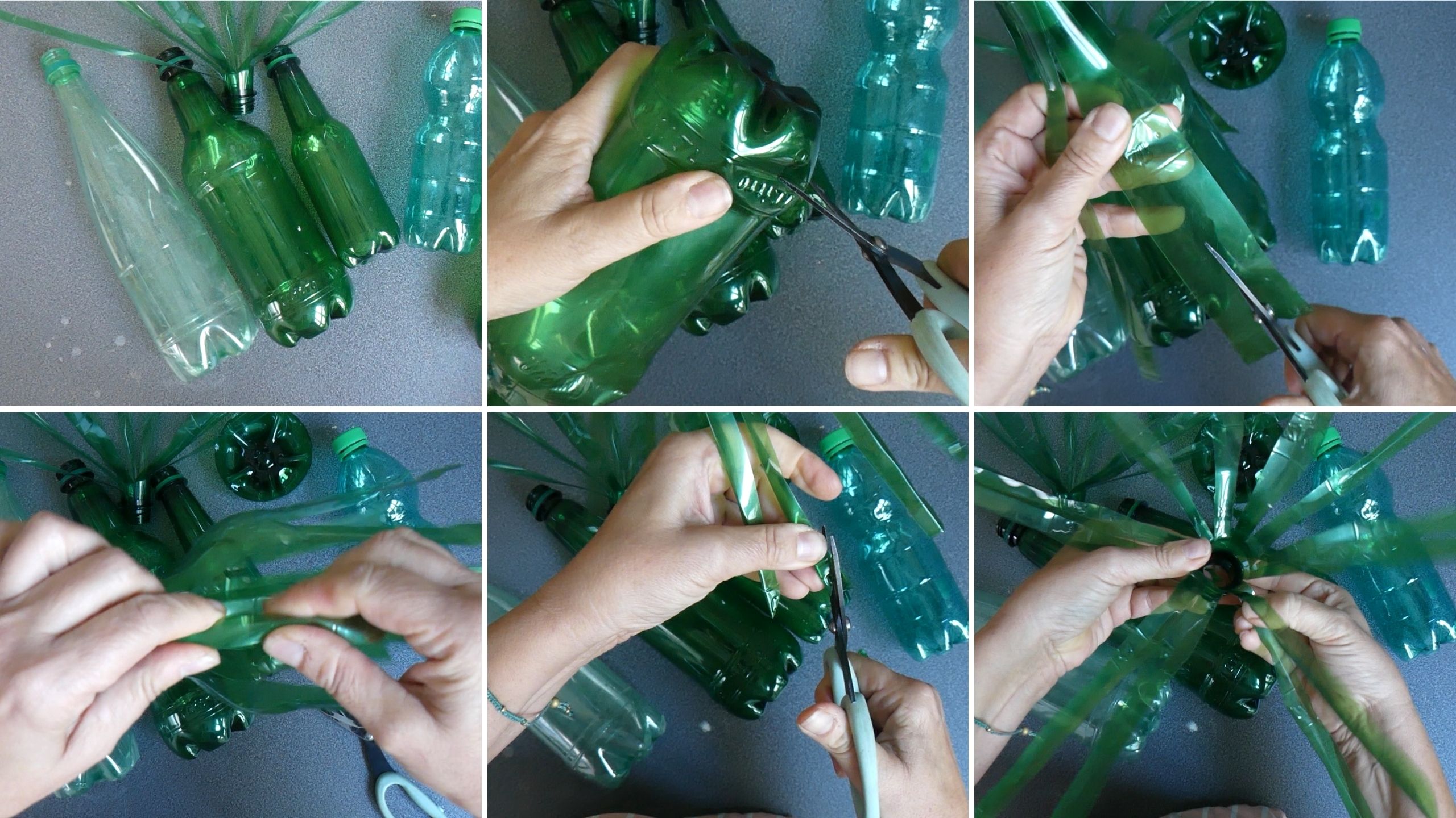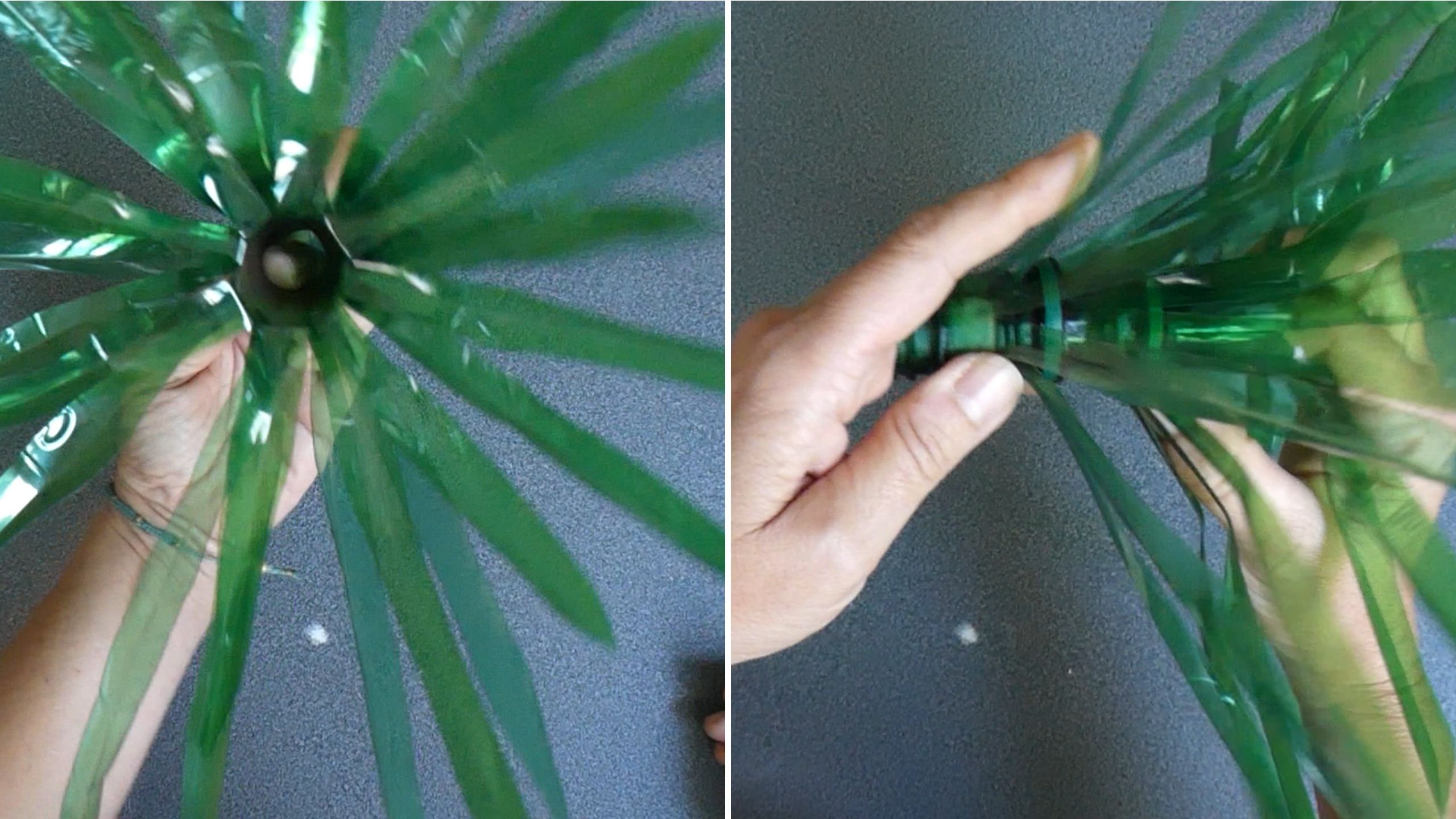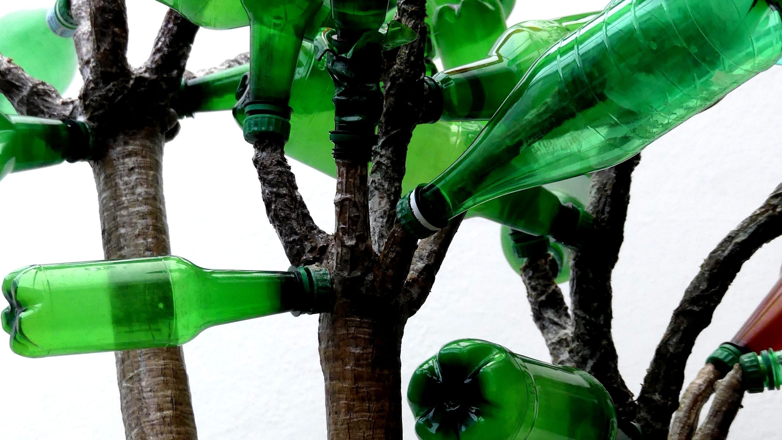Al final, aunque podría haber utilizado envases marrones, me decanté por los verdes. En total utilicé más de 150 botellas de plástico PET y más de 30 tapones. En cuanto a las hojas, hice algunas más redondeadas y blandas, más pequeñas y más grandes. Incluso llegué a pensar que podría dejar las botellas sin transformar. Pero escogí hacer hojas alargadas y puntiagudas, que irían unidas a las ramas gracias a tapones atornillados a las ramas.