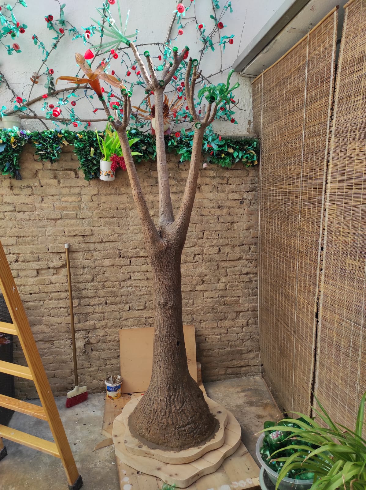 El árbol del que voy a hablar en esta publicación, #RedivivusPlasticPET, es una continuación de la serie #NaturalezaPlastica. Dentro de esta variedad de piezas, hay diferentes tipos, un ejemplo previo al árbol fue el Ficus Benjamina, para el que utilicé el tronco y las ramas de uno que ya no tenía vida, y le añadí las hojas hechas con envases de plástico de color marrón.