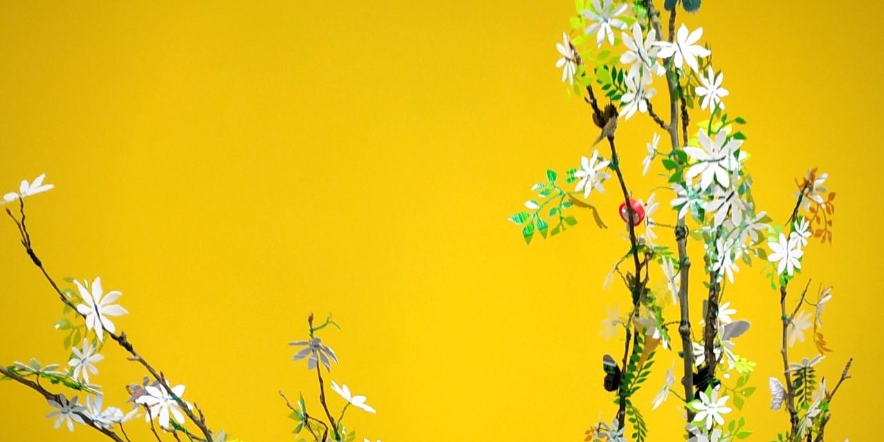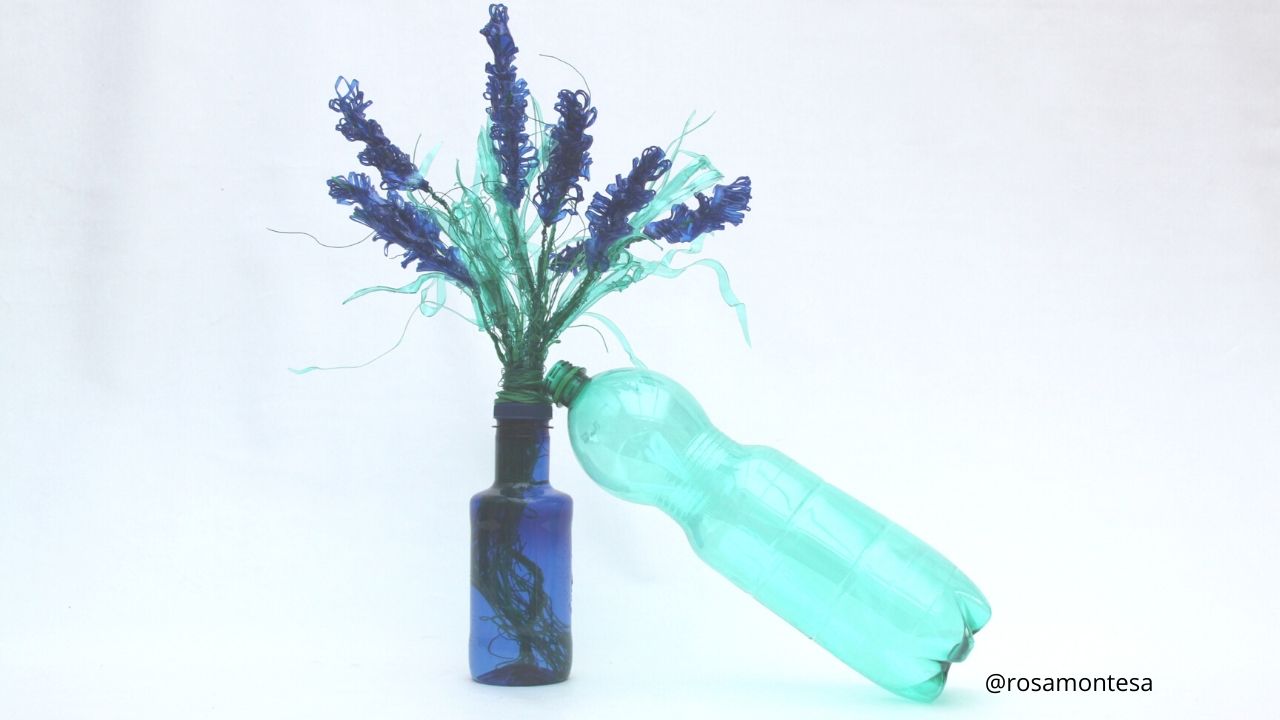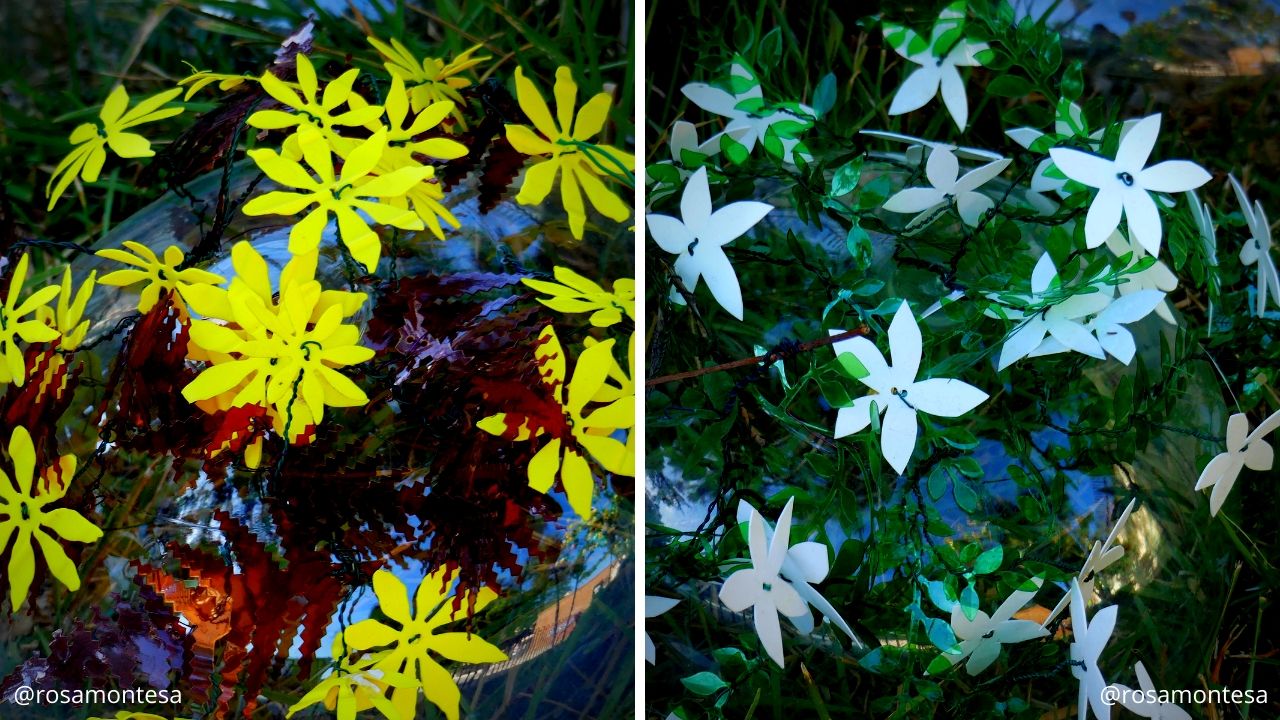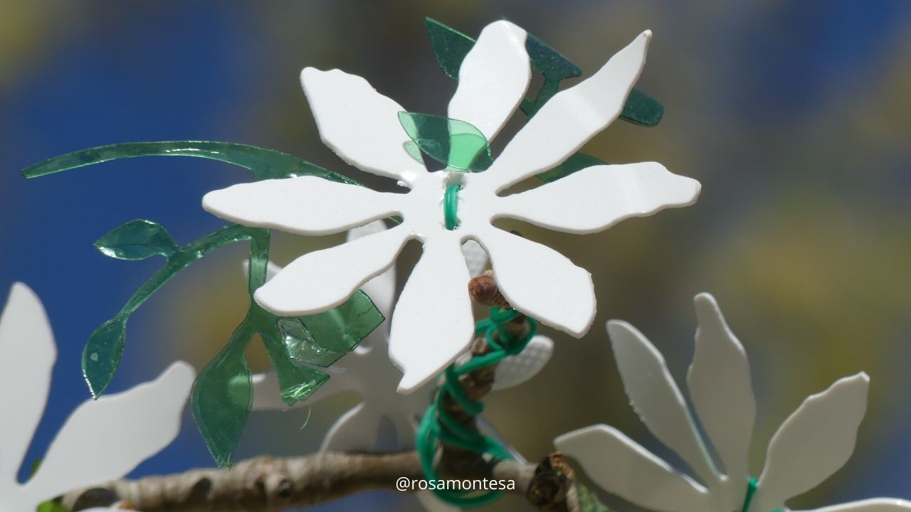Tuvimos que dejar a un lado el reciclado creativo de plástico utilizando calor por el peligro de su uso con los niños. Por esa razòn, optamos por el recorte. Mucho más sencillo y menos problemático para los pequeños. Utilizamos tijeras, pero también la opción de troquelado. Esta última técnica resulta casi mágica para los más pequeños. Se cortan las botellas haciendo pequeñas planchas, que luego se pasan por la troqueladora, utilizando plantillas de flores y hojas, conseguimos que los niños hicieran piezas para esta especie de jazminero.