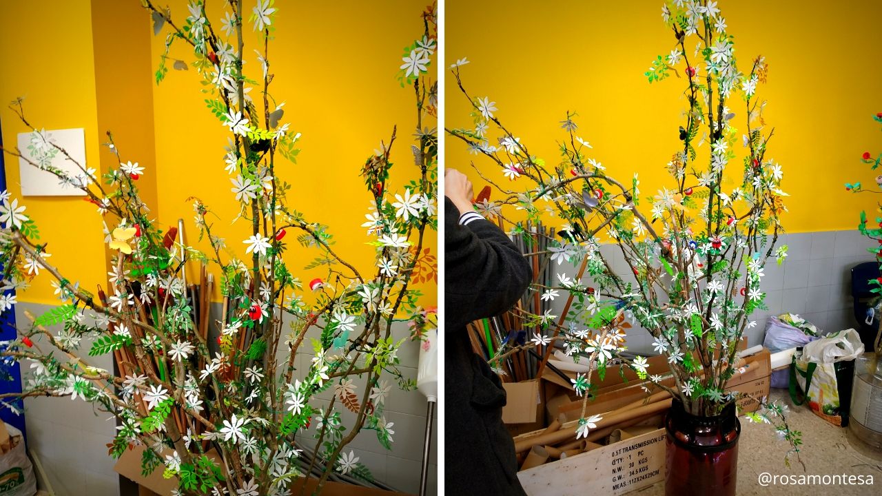 Las hojas verdes se hicieron con botellas verdes de plástico PET (por ejemplo las de agua con gas) y otros verdes con botellas de productos de limpieza (como lejía, detergente,etc). El tronco y las ramas se consiguieron de la poda de árboles del colegio.