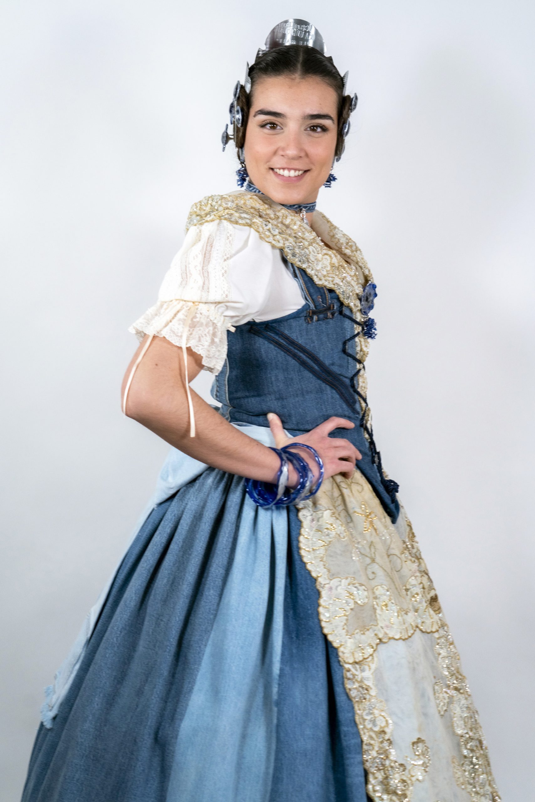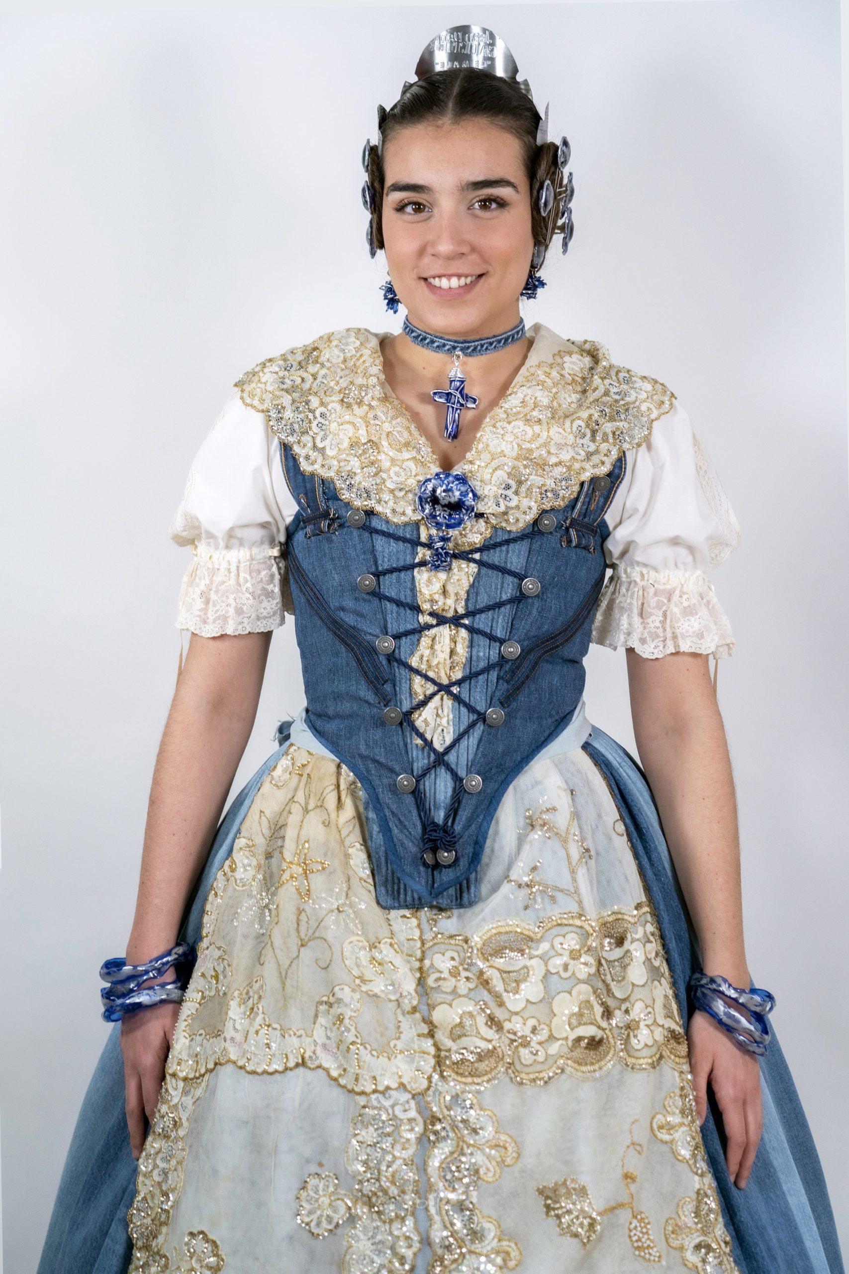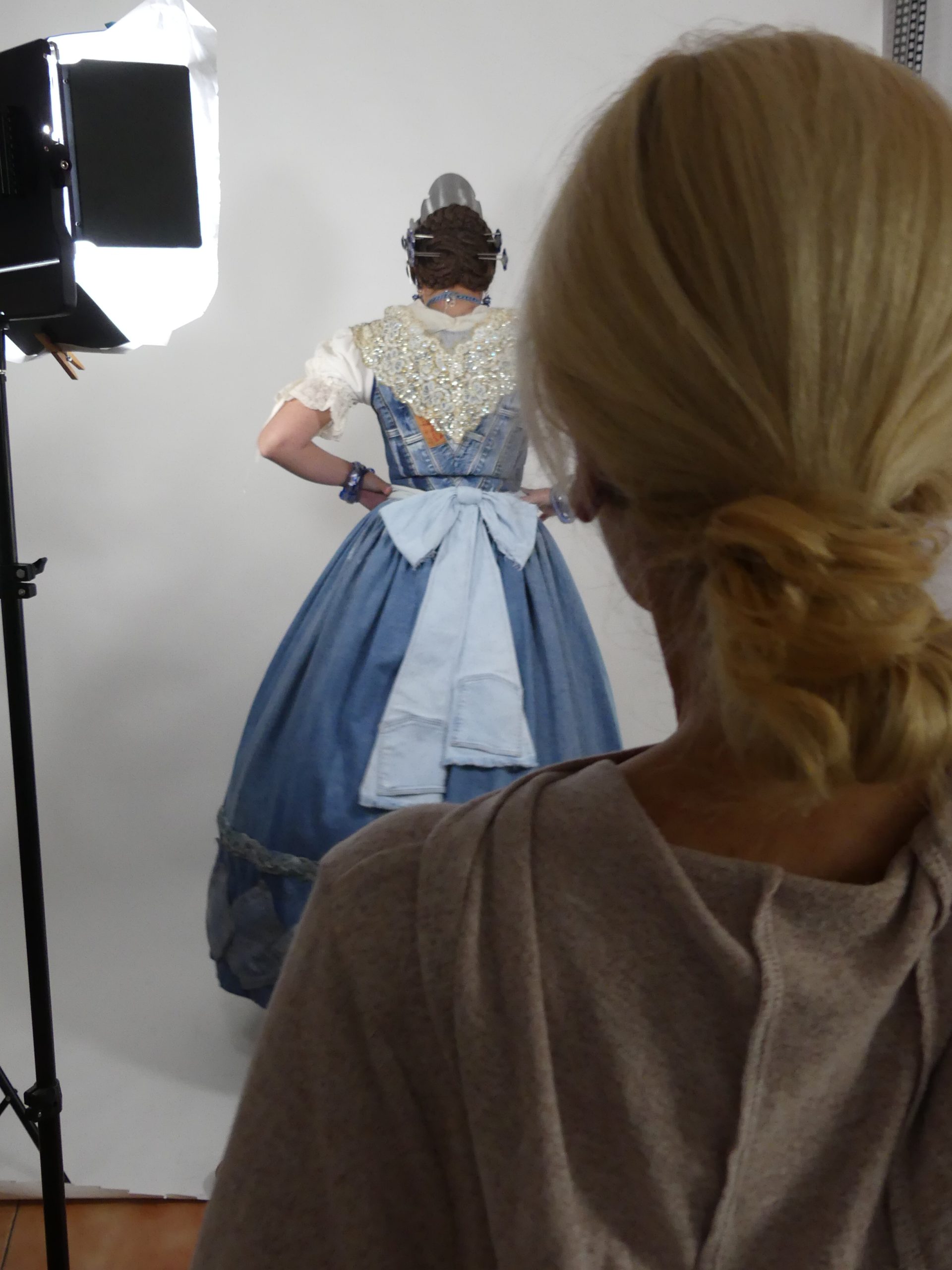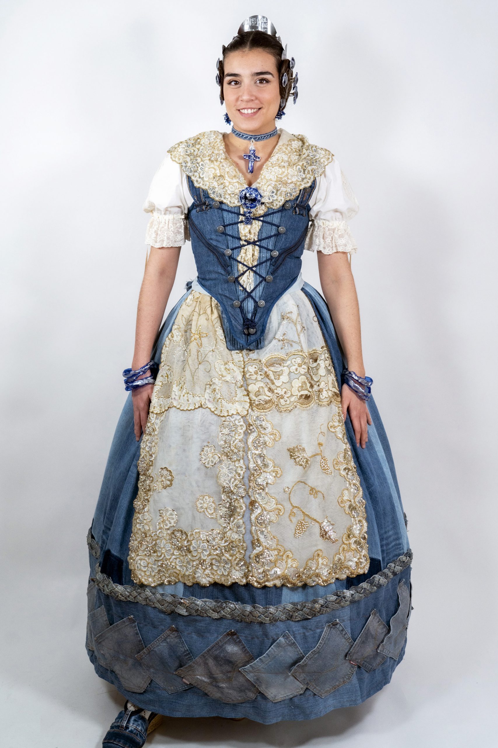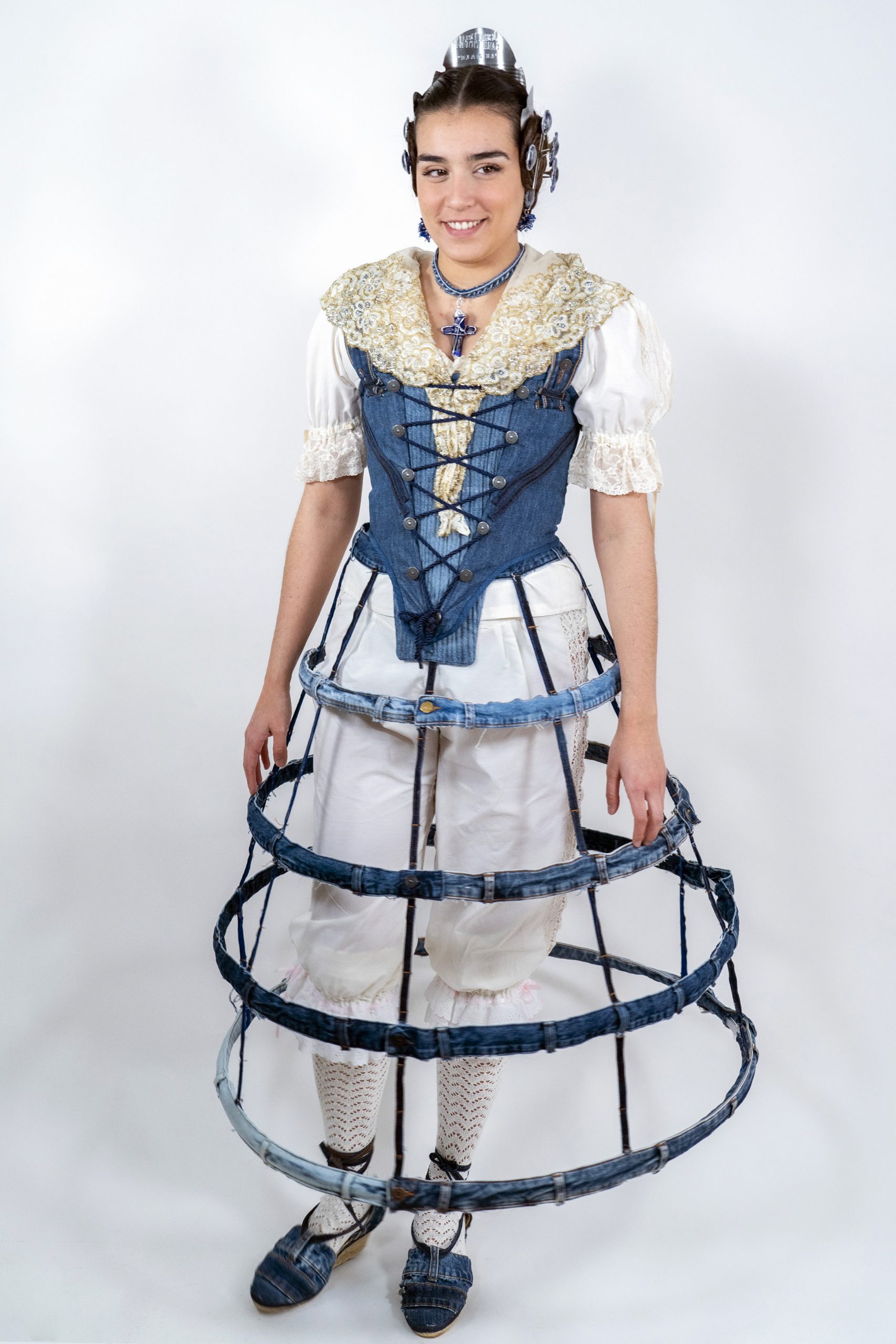 Upcycling jeans, o lo que es lo mismo: reciclando vaqueros (con un estilo valenciano). Hemos realizado un traje de valenciana con una visión divertida, creativa, vintage y global de un estilo muy local, como es la indumentaria valenciana.
