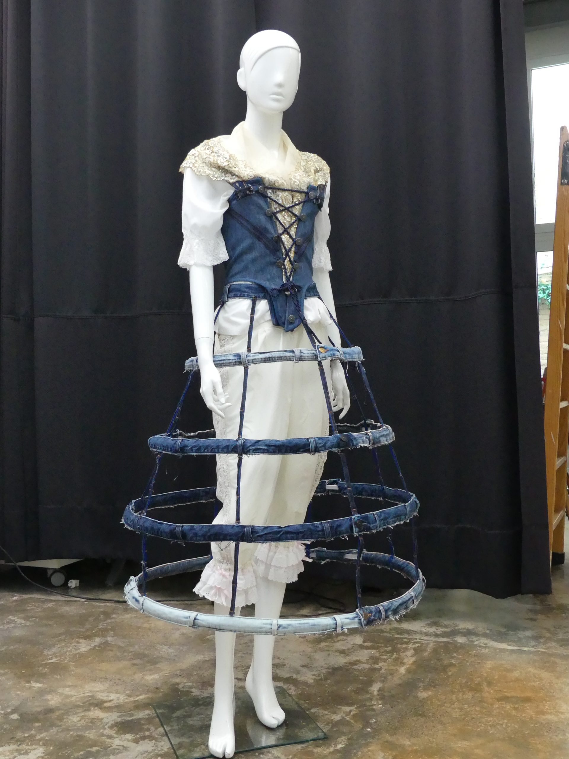 - POLLERA O MIRIÑAQUE: Realizada con 4 aros de diferentes tamaños forrados con 14 cinturas de pantalones. Unidos verticalmente con tiras de trabillas realizadas para la ocasión por Jeanologia. La cintura está hecha con una cintura de pantalón.