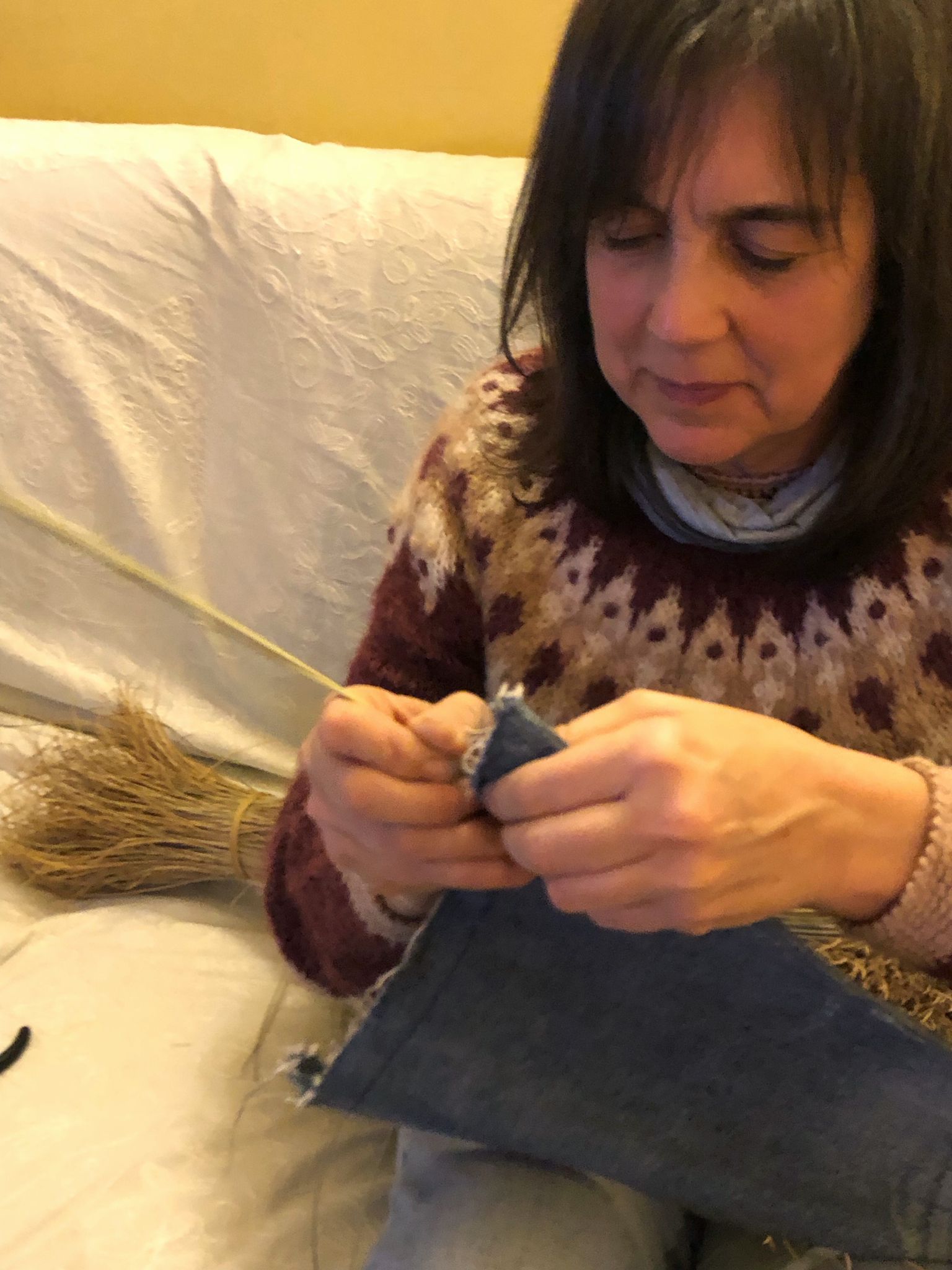 La manteleta y los delantales los hemos sacado de los baúles familiares. La manteleta me la bordó mi madre en 1976. Los delantales de esa época eran muy pequeños, así que decidimos crear un nuevo delantal uniendo dos que hizo mi madre junto a uno que le hizo mi tía Carmen en 1968 y a otro que hizo mi prima Lucía cuando era pequeña.