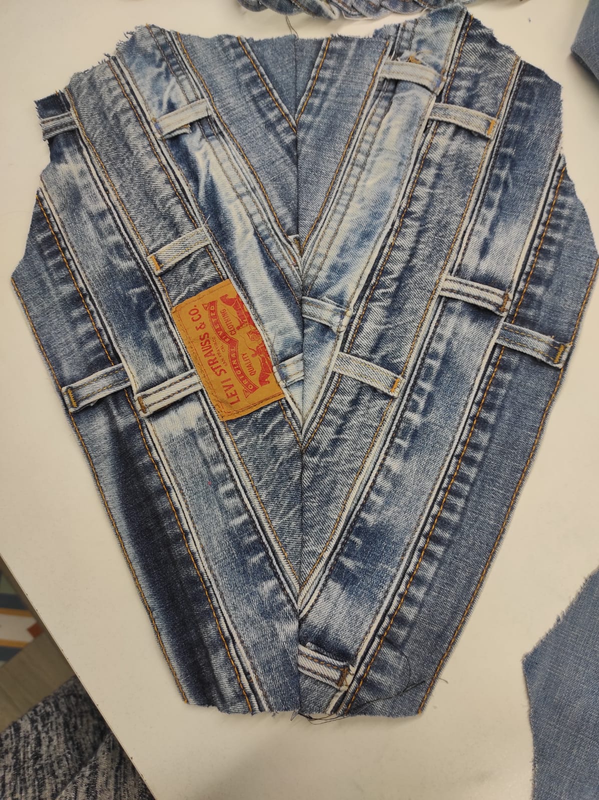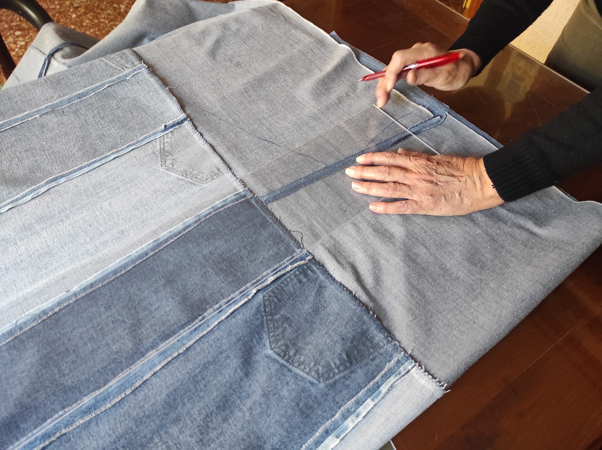 Al principio, comenzamos a guardar todos los pantalones vaqueros que nuestro entorno ya no utilizaba. Pero nos dimos cuenta que necesitábamos mucho más, así que contactamos con Jeanologia, una empresa fabricante de tecnología, que ofrece soluciones textiles sostenibles. No solamente han colaborado proporcionando tejido denim de descarte, también han puesto a nuestra disposición el taller. Sin ellos, no creo que hubiera sido posible sacar este proyecto adelante.