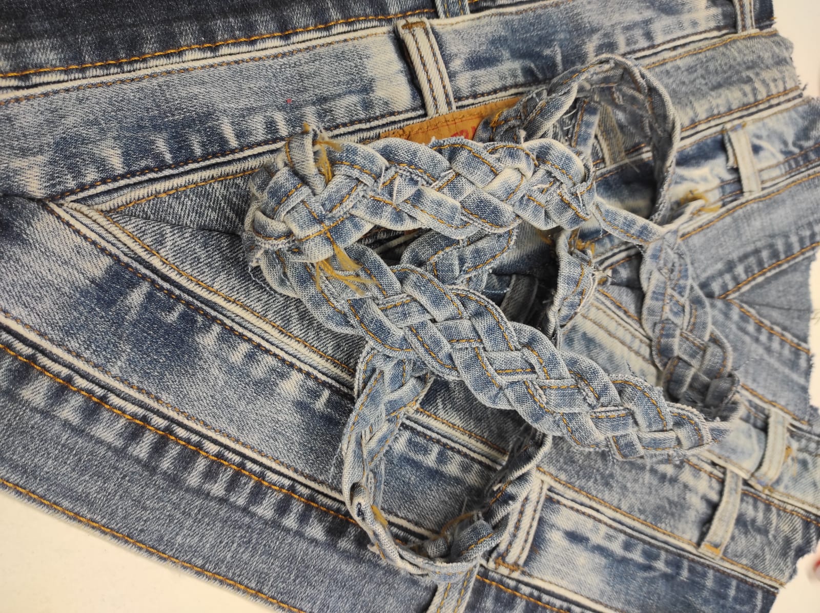 - FALDA: realizada con 9 camales de pantalones vaqueros, cortados en 17 tiras y unidas verticalmente. Rematando la parte horizontal hay 4 camales cortados y cosidos. Para embellecer, una cenefa con 20 bolsillos traseros y una trenza realizada con costuras de pantalones a modo de tapacosturas. Tanto los bolsillos como la trenza han sido tratados para darle color plateado. La cintura está hecha con una cintura de pantalón.