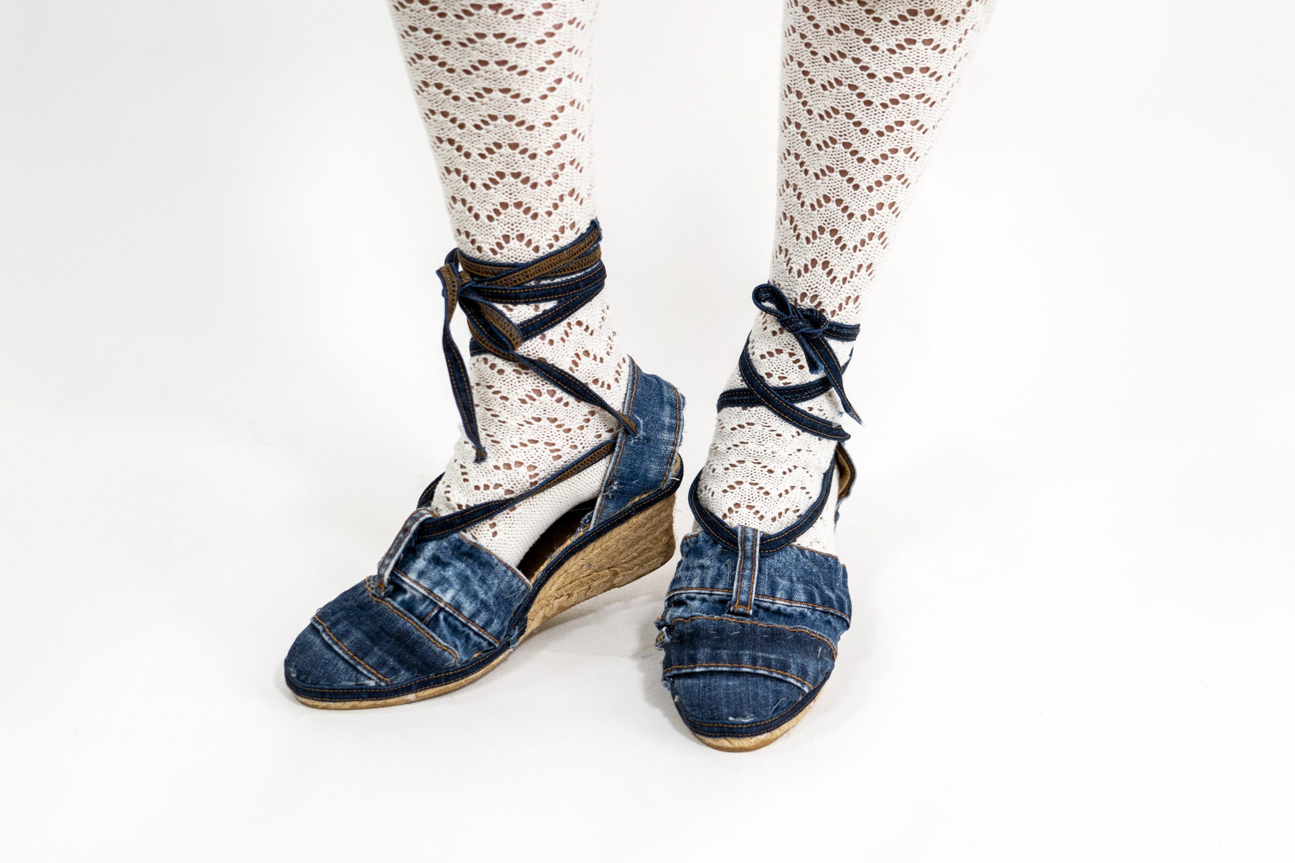 - ALPARGATAS: hemos reutilizado alpargatas y las hemos forrado con cinturas de pantalón, restos de tejido y, para atar, una tira de trabilla realizada a propósito para este fin.